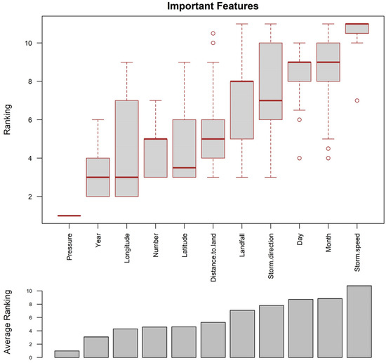 The boxplot visualization reveals that minimum central pressure or pressure is the most influential factor for predicting typhoon intensity, consistently ranked at the top with minimal variation. This indicates that the minimum central pressure is crucial for accurate predictions. Longitude and year follow in importance, although with moderate to high variability, suggesting their significance can differ based on specific conditions or datasets. Features like latitude, distance to land, and number show moderate importance and variability, indicating their roles are somewhat dependent on other interacting factors. The lower rankings of landfall indicator and storm direction, despite their expected significance, suggest these features might not be as critical in this model ensemble’s predictions. Features such as day, month, and storm speed are among the least important contributors, with storm speed consistently ranked low, implying it does not significantly affect intensity predictions (as shown in Figure 9).