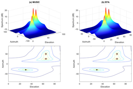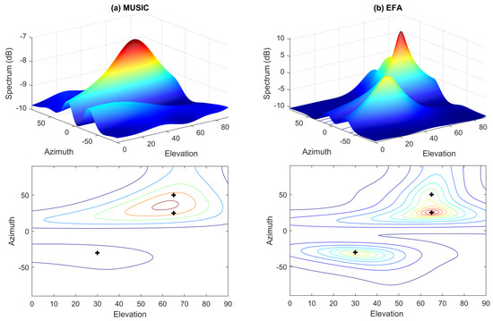As a special case of nonuniform white noise, uniform white noise is considered in this example. Firstly, we assume that no outliers exist. The SNR is 10 dB. Figure 1 shows the resultant spectra and their contour plots of the MUSIC- and EFA-based approaches. It should be mentioned that in all simulations, the MUSIC algorithm is carried out by obtaining the subspace through the eigenvalue decomposition of the covariance matrix estimate, . From Figure 1, we notice that in such an ideal case, i.e., in uniform white noise and in the absence of data outliers, the two methods perform very well; the elevation as well as azimuth angles of the sources can be correctly estimated.
