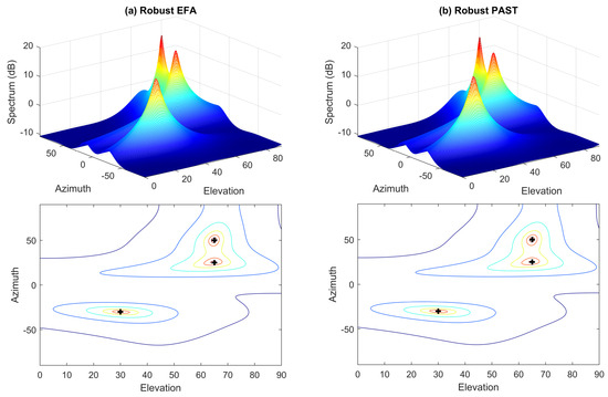 In this subsection, we assume that the data are corrupted by outliers. Figure 2a,b show the spectra and their contour plots of MUSIC and EFA in such a situation. It can be found that the data outliers can significantly deteriorate the performance of these nonrobust methods. Specifically, the spectra do not form proper peaks at the true DOAs. On the contrary, it can be seen from Figure 3a that the hostile effect of data outliers can be effectively suppressed by the proposed robust EFA method and hence, the DOAs can be still correctly estimated from the spectra. In the robust EFA method, the weight for the trimmed data point is set to . For comparison, the performance of the conventional robust PAST algorithm [18], where the forgetting factor is set to 0.95, is also tested and the corresponding result is shown in Figure 3b. We notice that the robust PAST algorithm also provide satisfactory performance in this case.