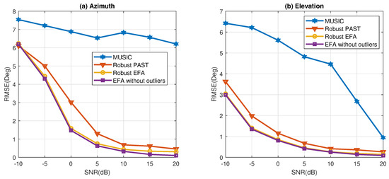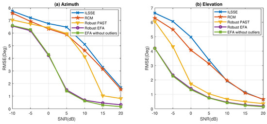 To further show the ability of the robust EFA against outliers, the RMSEs of azimuth and elevation estimation using this method are compared to various methods, including ILSSE, RCM, robust PAST, and the benchmark method (EFA without outliers) in Figure 10. We notice that the hostile effects of outliers can be successfully suppressed in all SNR levels tested, and the performance is quite closed to the case without outliers. Moreover, although the robust PAST algorithm is robust against outliers, it cannot suppress the nonuniform noise effectively, and hence, it is outperformed by the proposed method. For the ILSSE and RCM algorithms, although they can perform well in nonuniform noise, they cannot provide robustness against outliers and perform even worse than the robust PAST algorithm.