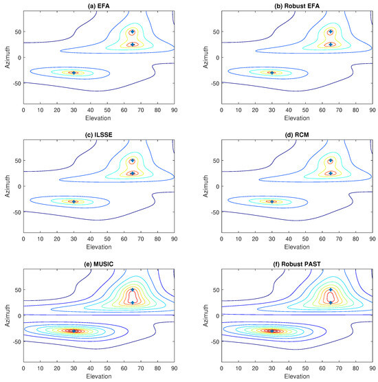 In this subsection, the noise is assumed to be nonuniform white. Firstly, we assume that there are no outliers in the data matrix . The SNR is 10 dB according to (46). Figure 6 shows the resultant contour plots of the spectra of various methods including EFA, robust EFA, ILSSE [9], reduced covariance matrix (RCM) [11], robust PAST [18], and MUSIC. Obviously, we can notice from Figure 6e,f that two peaks of the MUSIC spectrum and robust PAST spectrum are merged together. This is because in the nonuniform white noise environment, the subspace cannot be well estimated by these approaches. On the contrary, the EFA-based approaches (EFA and robust EFA), ILSSE, and RCM take the noise nonuniformity into account, so that the subspaces and DOAs can be properly determined.