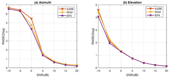 Comparison of the RMSEs of angle estimation versus SNR in nonuniform white noise with outliers: (a) azimuth angle; (b) elevation angle.