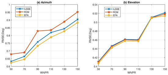 In order to examine the influence of the degree of the noise nonuniformity on DOA estimation, we change the maximum noise power, i.e., in (46), from 25 to 75, and keep . Therefore, the worst noise power ratio (WNPR), is varied from 50 to 150. For each WNPR, the SNR remains to be 10dB. It is seen from Figure 8 that the performance of all the tested methods degrades with the increase of WNPR. In general, the proposed EFA-based method achieves better performance than the other two methods.