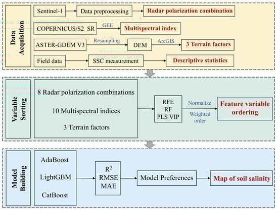 This study utilizes satellite observation data from Sentinel-1 and Sentinel-2, along with Digital Elevation Model (DEM) data, to compile a feature variable dataset, with soil salinity content from field-collected soil samples serving as the target variable. Initially, the final feature variable importance is determined by weighted calculations using three feature variable selection algorithms. Subsequently, three different machine learning algorithms are employed to develop soil salinity inversion models, screening for the optimal results. The optimal model is then used to invert the soil salinization distribution of the Weiku Oasis. The overall technical roadmap of this study is illustrated in Figure 2.