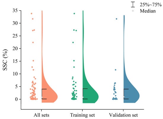 From Table 2, it is evident that the 89 soil samples collected in June were predominantly non-saline and salted soils, comprising 39% and 48% of the total samples, respectively. The modeling and validation sets, which were randomly divided, exhibit similar upper quartile, lower quartile, and median values, indicating comparable distribution structures (Figure 3). Thus, the soil salinity characteristics of these two datasets can be considered representative of the entire dataset.