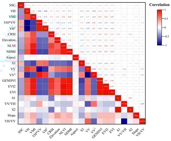 A Pearson correlation analysis was conducted between the radar backscatter coefficients and their polarization combination indices, 10 indices calculated from Sentinel-2, and 3 topographic variables with SSC. The results are shown in Figure 4.