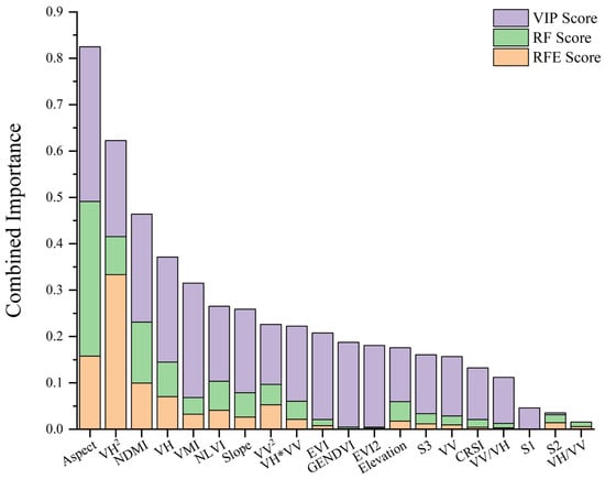 RFE, RF, and VIP methods were used to score the importance of 21 feature variables (2 backscatter coefficients, 6 SAR polarization combination indices, 10 multispectral indices, and 3 topographic factors) and normalize them for subsequent weighted calculations. The results of the three models’ scores are shown in Figure 5.