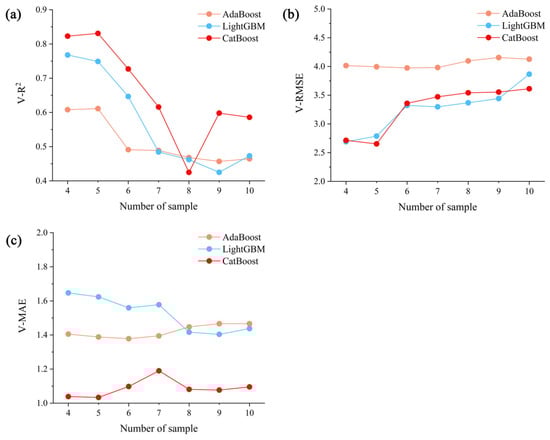 To validate the effectiveness of the normalized weighted importance scoring scheme, determine the optimal number of feature variables, and find the optimal SSC inversion model, this study selected the top 10 feature variables ranked by importance in Figure 6. The number of feature variables was sequentially chosen as the top 4, top 5, top 6, and so on, up to the top 10. According to the division method in Table 2, the 89 measured SSC points and their corresponding feature variables were divided into training and validation sets. SSC inversion modeling was conducted using AdaBoost, LightGBM, and CatBoost machine learning models, and model accuracy and stability were evaluated using R2, RMSE, and MAE indicators. The results are shown in Figure 7. V-R2, V-RMSE, and V-MAE represent R2, RMSE, and MAE for the validation set, respectively.