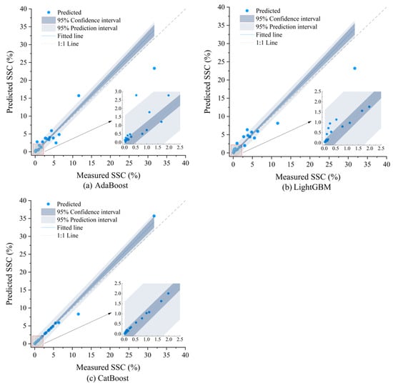 Figure 8 shows scatterplots of measured SSC and predicted SSC for the validation set under optimal feature variable settings for different models. The shaded area represents the 95% confidence interval, the blue solid line is the fitted line, and the gray dashed line is the 1:1 line. From Figure 8c, it can be seen that the scatter points of measured and predicted SSC under the optimal feature variable setting of the CatBoost model are closer to the 1:1 line. Figure 8a,b show that the scatter points of measured and predicted SSC under the optimal feature variable settings of the AdaBoost and LightGBM models are more scattered, with the fitted line deviating from the 1:1 line. Additionally, combining the three models, it is clear that the prediction effect is better for lower SSC values, but the prediction results are not ideal for higher SSC values. The prediction results show an overestimation of low values within the confidence interval.