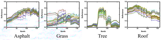 Urban is a large dataset consisting of pixels, with each pixel containing 162 spectral channels spanning from 400 nm to 2500 nm after the removal of channels 1–4, 76, 87, 101–111, 136–153, and 198–210 due to dense water vapor and atmospheric effects. This dataset contains a significant number of outliers and encompasses four endmembers: Asphalt, Grass, Tree, and Roof.