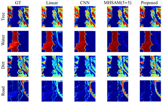 Table 4 presents the abundance RMSE and endmember SAD obtained by different unmixing methods on the Samson dataset. It is observed that all unmixing methods can accurately extract the endmembers “Soil” and “Tree”, but most encounter difficulties in extracting “Water”, possibly due to its low reflectance which makes it difficult to distinguish subtle differences in the loss function. In comparative experiments, only USTNet and the proposed method accurately extract the “Water” endmember, suggesting that the introduction of global spatial information aids in endmember extraction, a finding reinforced by [