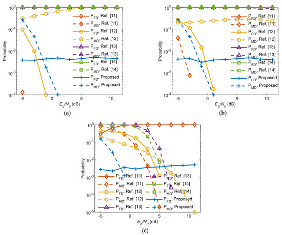 We can see from the solid lines in Figure 1a–c that the false detection probability of the proposed method is lower than those of the methods published in [11,13,14]. Under the situation with relatively high Eb/N0, the false detection probability of the proposed method is higher than that of the method in [12]. However, it can also be seen from the corresponding missed detection probability that the low false detection probability of the method in [12] is achieved at the cost of a very high missed detection probability. Thus, even though the false detection probability of the method in [12] is lower than that of the proposed method under higher Eb/N0, its corresponding missed detection probability is much higher than that of the proposed method, which indicates that the signal detection performance of the method in [12] is not better than the proposed method under low SIR and Eb/N0.