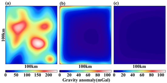 (a) Gravity anomalies generated by the study area R in the study area R; (b) Gravity anomalies generated by the boundary area M in the study area R; (c) Gravity anomalies generated by the far area N in the study area R.