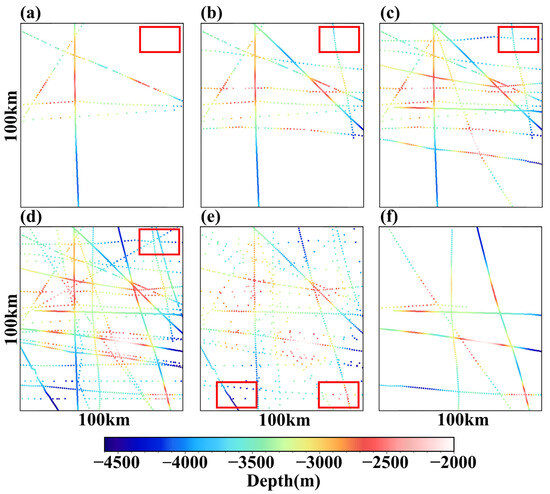 (a) Group 1 simulated ship soundings with a coverage of 5.4%; (b) Group 2 simulated ship soundings with a coverage of 10.76%; (c) Group 3 simulated ship soundings with a coverage of 17.68%; (d) Group 4 simulated ship soundings with a coverage of 31.80%; The red boxes in (a–d) are intended to illustrate in Section 3.2 that the accuracy of the prediction results heavily depends on the presence or absence of ship sounding coverage. (e) Group 5 simulated ship soundings with a coverage of 16.12% and the red box is intended to illustrate in Section 3.2 that with the same coverage, better coverage of special sea areas leads to higher accuracy in prediction results. (f) Group 6 simulated ship soundings with a coverage of 10.88%.