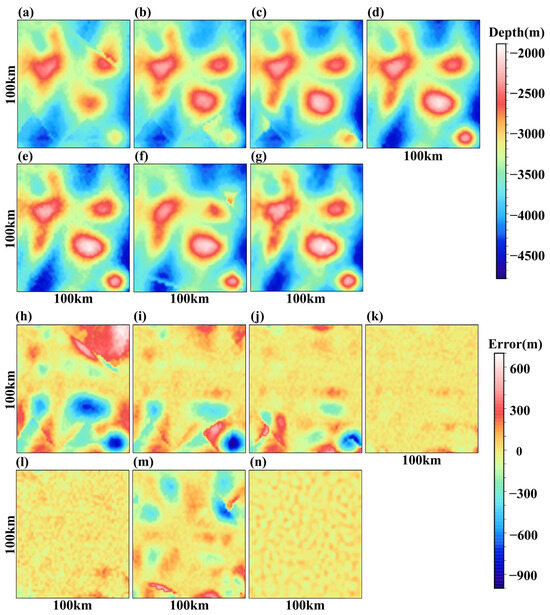 Figure 4a–d depicts the topographic outcomes obtained from the GGM for Group 1 through Group 4, respectively. Correspondingly, Figure 4h–k illustrates the error distributions of the prediction results relative to the simulated topography. From the topography results, it is evident that the overall shape of each group of topography remains consistent. Because the GGM is a fitting algorithm, the inverted topography and gravity anomaly also have strong similarity. With the increasing availability of ship soundings, the maximum and minimum value of the topography prediction results gradually converge towards the true values. In other words, the accuracy of the prediction results heavily depends on the presence or absence of ship sounding coverage. This conclusion is further supported by the error distributions of the prediction’s results. It is evident from the red boxes positioned in the upper right corner of Figure 3a–d that there is a gradual increase in ship soundings from Group 1 to Group 4. This increase correlates with the reduction in errors illustrated in the upper right corner of Figure 4h–k.