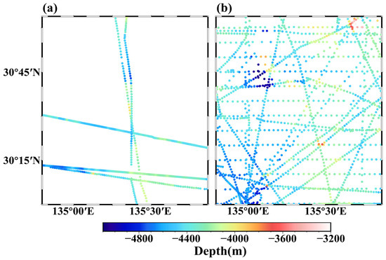 Similar to the control group in the simulation experiment, we divide the ship soundings into two parts. The first part of the ship soundings (Part I) consists of 5 survey lines with 820 points, selected in a more centralized distributions, as shown in Figure 7a, resulting in a coverage of 8.19%. The second part of the ship soundings (Part II) consists of 1626 points, as shown in Figure 7b, uniformly distributed throughout the entire selected sea area, resulting in a coverage of 33.47%. In this way, we create a control group in which Part I is used for calculation and checking, like the ship soundings in the simulation experiment, and Part II is only used for checking, like the grid points in the simulation experiment. Conversely, Part II is used for calculation and checking while Part I is only used for checking. The statistical results for the sounding points of the two parts are shown in Table 4.