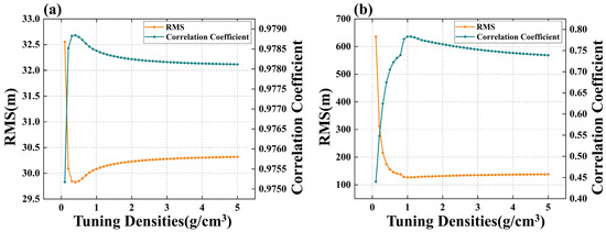 (a) RMS error and correlation coefficient curves of GGM at different “tuning” density differences when Part I is used for calculation; (b) RMS error and correlation coefficient curves of GGM at different “tuning” density differences when Part II is used for calculation.