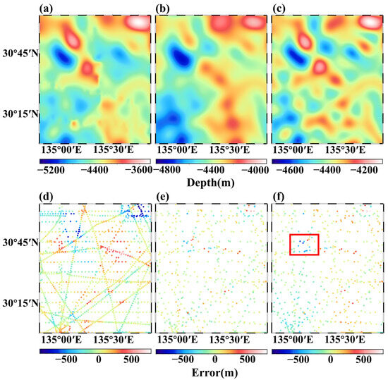 Furthermore, we analyze the error distributions at checking points of Part II, as shown in Figure 9d,f. As depicted in Figure 9d, larger errors are observed when Part I is used for the GGM. This discrepancy primarily arises from the inadequate coverage of the selected sea area by the ship soundings of Part I used in the calculation. The maximum error of the analytical algorithm is −598.37 m, occurring at the location marked by the red box in Figure 9f. Notably, this occurs in the most obvious area of topographic relief in Figure 9c. We applied an error threshold of 5% (95% confidence interval) derived from the mean value of the ship soundings. Consequently, the permissible absolute error is 219.63 m (5% of 4392.62 m). In reviewing the error distributions of the GGM using Part I and Part II for calculation, as well as the analytical algorithm, we observe that the percentages of absolute errors within 219.63 m are 77.86%, 92.99%, and 84.13%, respectively. This suggests that more than 80% of the prediction results from the GGM using Part II for calculation and the analytical algorithm successfully meet the required accuracy threshold.