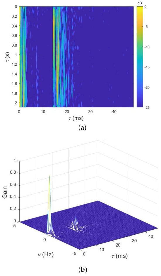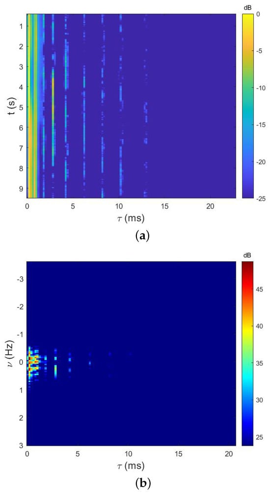 Figure 3 describes the channel structure in the time domain (Figure 3a) and the scattering function of the UWA channel (Figure 3b). It is clear that at least nine clusters of multipath with obvious time variance are shown in Figure 3a. The Doppler offset of each path in the channel in the DD domain is plotted in Figure 3b. We can find that it tends to be different with taps. Moreover, the maximum range of the Doppler spread is near in the first cluster of this channel.