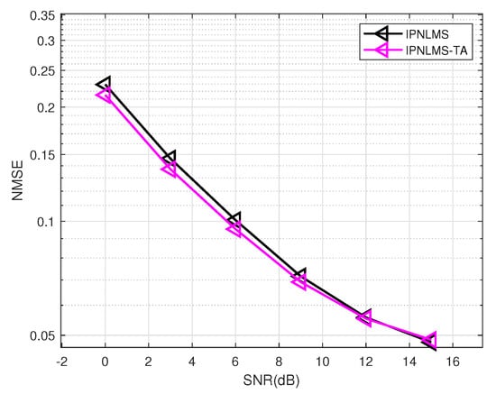 Figure 5 plots an estimation accuracy versus SNR of various adaptive algorithms. To clarify the impact of denoising method 2 on single-directional IPNLMS, we first compare the normalized mean square error (NMSE) among several methods, as shown in Figure 5a. IPNLMS-single represents that the estimate of each filter is denoised by denoising method 1, only averaging the estimates. IPNLMS-MA-single and IPNLMS-EMA-single represent the adaptive channel estimation technique that includes an MA or EMA filter with a step size of 5 in the IPNLMS-single basis, respectively. The performance improvement of adding an MA or EMA filter to IPNLMS-single is evident from the graph, both ranging from 0 to 0.1 dB. By comparing IPNLMS-MA-single and IPNLMS-EMA-single, there is little difference in performance between the two MA filters.