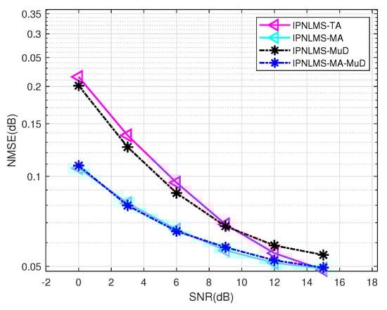 Earlier in this section, we verified that all three denoising methods can be used to enhance the estimation accuracy of adaptive channel estimation algorithms in UWA channels. To choose the method with the best estimation accuracy, we combine three denoising methods and compare their performance with other methods mentioned above, as shown in Figure 6. The IPNLMS-MA-MuD means, on the basis of IPNLMS-MuD, an MA filter is added in each direction of the adaptive channel estimation. Through the comparison, we can find that IPNLMS-MA-MuD performs best in these four adaptive channel estimation algorithms, especially in low SNR conditions, which conform to the characteristics of the marine environment. In conclusion, the simulation experiments we conducted above preliminarily demonstrate the improved estimation accuracy of the proposed method over previous methods.