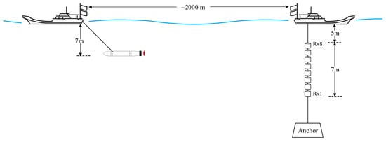 To further verify the effectiveness of the proposed IPNLMS-MA-MuD method, we conducted a single-input single-output (SISO) UAC experiment in real underwater acoustic communication scenarios. This field experiment was part of the main objective to drive the UWA channel equalizer’s channel estimation. The UAC experiment was conducted in July 2022 at the Danjiangkou Reservoir in Hubei Province; the experiment scene is shown in Figure 7. The experimental site had an average depth of 50 m. The transmitter transducer was located at about 23 m underwater in a static state and at a depth of about 3 to 7 m when moving. The receiver used an eight-element array with a 1-meter spacing between elements, and the top hydrophone was 5 m below the surface. The communication distance between the transmitting and receiving boats ranged from 300 to 1500 m, with the receiving boat remaining stationary and the transmitting boat moving at a speed of 2 to 4 knots. The receiving hydrophone had a sampling frequency of 48 kHz. Each set of data obtained from the experiment contained 16 groups of OTFS symbols.