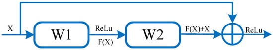 The backbone network plays a crucial role in semantic segmentation, where an appropriate backbone network can more accurately extract features from images, resulting in enhanced segmentation accuracy. With the success of AlexNet [53], an increasing number of complex neural networks have gradually come into the public eye. VGG [54] enhances network performance by increasing its depth, while GoogleNet [55] executes multiple convolution and pooling operations in parallel, achieving deeper networks with reduced parameters. MobileNet [56] finds wide applications in mobile and embedded systems, and FCN employs fully convolutional layers to process input images, enabling pixel-level labeling or segmentation. The mentioned networks are currently popular backbone networks that exhibit good performance in semantic segmentation tasks. Deepening the network layers enables the extraction of richer and more intricate features from images, thereby enhancing segmentation accuracy. However, deeper networks may face challenges such as gradient explosions and overfitting. Moreover, increasing parameters with network depth raises computational demands, limiting the network’s applicability. In summary, in this article, we have chosen ResNet50 as the backbone network. The residual network structure of ResNet effectively addresses issues like gradient explosions and overfitting [57]. The residual structure, depicted in Figure 2, differs from regular connections by introducing a shortcut mapping that directly connects the input and output. This approach captures the differences between input and output.