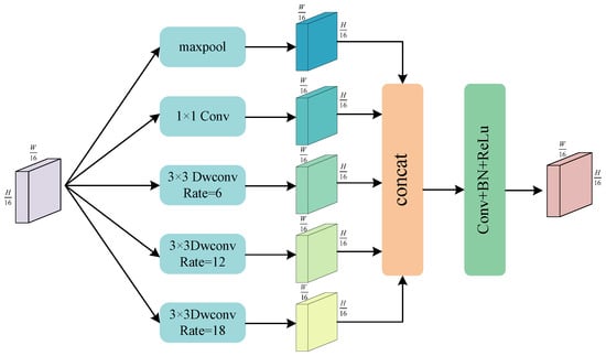 This module obtains multiscale contextual information by using convolutions with different dilation rates. The structure of this module is shown in Figure 3. Regular convolutions, due to their smaller receptive field, can only capture local features. In this module, we use convolutions with dilation rates of 6, 12, and 18 to achieve larger receptive fields. Convolutions with different dilation rates focus on different features, thereby helping us obtain more contextual information. Max pooling involves downsampling the input feature map to enlarge the receptive field and gather more contextual information by reducing resolution. Additionally, the module includes a convolution aimed at reducing the number of channels to decrease computational complexity. Finally, the features obtained from these operations are integrated to produce the ultimate feature map. The feature map obtained through this module contains more contextual information compared to previous ones, effectively improving segmentation accuracy.