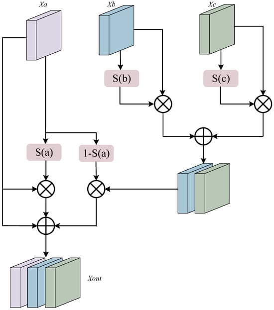 This module integrates features from the first three layers of ResNet by assigning different parameters to each layer, extracting and fusing shallow network features. Through the analysis of each feature, irrelevant interference is removed, and useful information is fused. In this paper, the sigmoid function is utilized to classify the usefulness of features. When the sigmoid value is closer to 1, it indicates more usefulness and such information is retained. If the sigmoid value is closer to 0, it signifies lower usefulness and other features are used to complement and fuse with this feature. The module is illustrated in Figure 8.