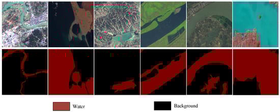 The water body dataset is derived from the multispectral remote sensing images of the Chinese HJ-1A (HJ-1B) environmental remote sensing satellite and the multispectral remote sensing satellite Landsat-8 from NASA. The Landsat-8 satellite images consist of 11 bands, and the water body dataset is primarily composed of images from the 4th, 3rd, and 2nd bands. The resolution of Landsat-8 satellite images is 10,000 × 10,000, and the resolution of Google images is . We cropped them to images with a resolution of . After cropping, we performed data augmentation, resulting in a total of 8000 images in this dataset. We split the dataset into training and validation sets with a ratio of 4:1. This dataset is a binary classification dataset, where the labels of the images fall into two categories: water and background. The dataset encompasses rich information on water, including various shapes, types, and colors of water, effectively evaluating the model’s generalization ability. Partial displays of this dataset are shown in Figure 10.