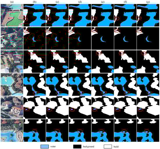 Later, we further compared the heatmaps of the ablation experiments, as shown in Figure 12. In the heatmap, shades of orange-red represent pixels of primary interest, while yellow and blue indicate secondary pixels. The first row depicts the results for water, and the second row illustrates the results for building. From column Figure 12a, it can be observed that although the backbone network can roughly capture the areas of building and water bodies, the boundaries are too blurry, and the handling of surrounding noise is poor. After incorporating the Context-Aware Spatial Feature-extraction module shown in Figure 12b (column), the boundary information of water bodies and building becomes clearer. Subsequently, with the addition of the Feature-Interaction Module Figure 12c (column), it can be seen that noise within the heatmap is notably diminished, and the model concentrates more on pixels corresponding to building and water bodies. After incorporating the Multi-Channel Deep Feature-Extraction Module, the overall network shows a noticeable improvement in handling image details. The colors for building and water body areas become darker, and the contours become more pronounced, achieving precise segmentation of the image.