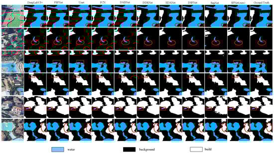 To obtain a clearer insight into the processing performance of each network, we visualized the segmentation outcomes for six images from the dataset, as depicted in Figure 13. Each column represents the predicted output of each model, and the last column represents the original labels. From Figure 13, it’s evident that conventional semantic segmentation networks effectively segment rivers and building, but the results mostly provide a rough outline and shape, losing many details. Additionally, traditional networks may encounter misjudgments in more complex areas. In contrast, the proposed network handles details better, achieving accurate segmentation of building and water bodies. Traditional semantic segmentation networks tend to overlook small areas of water bodies and building, as highlighted by the red circles in Figure 13. However, our network effectively avoids this issue by incorporating a Multichannel Deep Feature-Extraction Module to handle image details. In cases where building and water bodies are similar to the background, as indicated by the red rectangles in Figure 13. traditional networks may make misjudgments. We address this by introducing a Spatial Relation Perception Feature-Extraction Module to enhance spatial information processing, effectively distinguishing between the background and building or water bodies, thereby reducing misjudgments. Furthermore, our model exhibits fewer noise artifacts in the predicted images compared to SegNet, as attention mechanisms are incorporated in both the Spatial Relation Perception Feature-Extraction Module and Feature-Interaction Modules, mitigating the impact of noise.