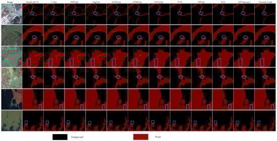 As shown in Figure 14, The proposed model outperforms other networks on the water dataset is superior to other networks. In the highlighted regions of the circles, some water areas with similar colors to the background resulted in misjudgments. Among all the compared networks, the effect of SPNet proposed in this paper is the best, with the fewest misjudgments. The dataset also contains many small water areas that are often ignored by networks due to their small size, as indicated by the rectangular marked area in Figure 14. However, SPNet, introduced in this paper, incorporates a spatial information-extraction module, enhancing the understanding of features regarding their position, size, and shape. This effectively reduces instances of missing information.