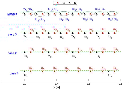 Beyond the multimonostatic configuration (here referred to as MM/MF), three multiview-multistatic setups, differing for the number of Tx antennas , are considered (see Figure 3):