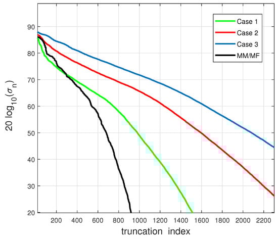 The curves in Figure 4 show the singular values of the operator relevant to the four considered measurement configurations. As expected, the curves exhibit a rapid decay as the truncation index grows, and the curve referred to the MM/MF configuration experiences a faster decay than Case 2 and 3. On the other hand, the curve related to Case 1 shows a slightly faster decay than MM/MF in the interval , after which an opposite trend is observed. In general, the curves of the multiview-multistatic setup suggest that, for a fixed TSVD threshold, the number of the singular values above the threshold increases with the number of Tx antennas and, accordingly, better imaging capabilities are expected.