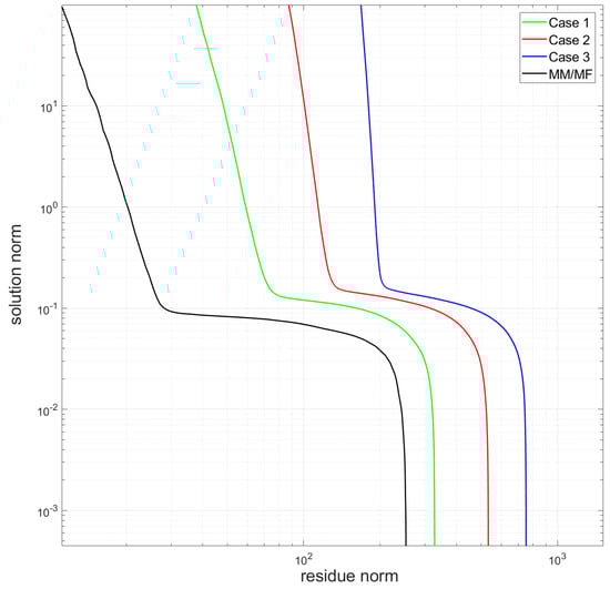 The determination of the optimal value of is a challenge that is here effectively faced using the L-curve method [42,43]. The essence of the L-curve lies in its graphical representation of the trade-off between the norm of the solution and the norm of the residue , as the regularization parameter varies. On a logarithmic scale, the L-curve typically exhibits an “L” shape, wherein the knee or corner of the curve provides the optimal regularization parameter, i.e., the value allowing the desired balance between accuracy and stability of the solution. In this work, a MATLAB package for the analysis and the solution of discrete ill-posed problems developed by Hansen [45] is exploited to determine the optimal truncation index.