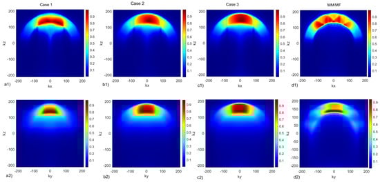 Cuts of the normalized spectral content relevant to the considered cases. The panels in the first row (a1–d1) represent the cuts in the plane, while the panels in the second row (a2–d2) are the cuts in the plane.