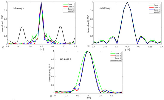 Comparison of the PSF cuts related to a point-like target placed at (0.5, 0.25, 0.3) m. Panels (a–c) show the PSF cuts along x, y and z, respectively.