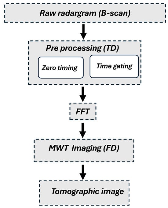 GPR raw data (radargrams) are generated over a fast-time window of 20 ns and processed according to the pipeline depicted in Figure 9. Specifically, the raw data are pre-processed in the time domain by means of the zero time and the time gating procedures. Firstly, a zero time setting is applied at ns to establish the reference point for the depth. Subsequently, the time gating is implemented by setting to zero the signal reflections up to ns. This gating procedure effectively eliminates artifacts arising from direct coupling between the and antennas, as well as reflections from the air–soil interface. A time window of 15 ns is considered for further processing. Following pre-processing, time domain data are transformed into the frequency domain using the Fast Fourier Transform (FFT) over the band GHz, with a step of 68 MHz. At this point, to simulate the real measurement process and assess the robustness of the imaging approach under realistic conditions, the data are corrupted by AWGN with dB.