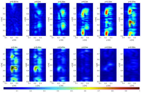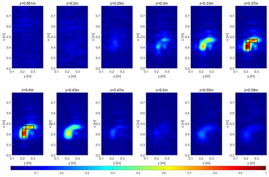 The constant-depth slices of the 3D tomographic reconstruction normalized to the maximum into the investigation volume are plotted for each configuration in Figure 10, Figure 11, Figure 12 and Figure 13.