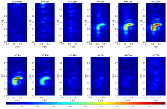 Depth slices of the full-3D tomographic reconstruction of the L-shaped target referring to Case 2. Color scale .