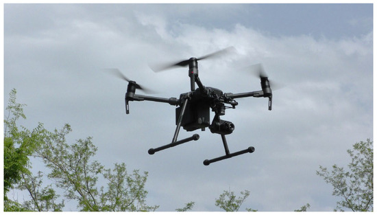 A UAS is utilized to collect finer-resolution remote sensing data at a test site (Figure 2). This work utilizes a DJI Matrice 210 multicopter UAS (DJI, Shenzhen, China) for the aerial system, and the DJI Zenmuse-XT2 (DJI, Shenzhen, China) is the sensor that is equipped aboard the UAS. The extensibility of the Matrice 210 is suitable for replacing various sensors for the objective of the flight. In this case, the Zenmuse-XT2 can capture both optical and thermal information at once, making it convenient for obtaining the data. The dual battery system enhances the flight performance for its flight duration and safety features, which makes it much safer to operate in urban areas.