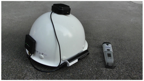 Reach (Emlid, Hong Kong) and DG-PRO1RWS F9P (BizStation Corp., Matsumoto, Japan) global navigation satellite system (GNSS) devices were utilized to record the geographical coordinates (Figure 3). The devices can record multiple L1 GNSS signals, e.g., GPS (Global Positioning System), QZSS (Quasi-Zenith Satellite System), GLONASS (Global Navigation Satellite System), Galileo, BeiDou, etc., for the Reach and both L1 and L2 signals for the F9P device (dual-frequency GNSS). The equipment was used together with a thermohygrometer to record the temperature and relative humidity at each geographical location. The two GNSS devices were used in different situations: the Reach device was utilized more in open areas, while the F9P device was used in densely built-up areas, where the limited sky view can impact the GNSS signals. An MJ-UDL-20 thermohygrometer logger (SATOTECH, Kawasaki, Japan) was used for logging the temperature and humidity with a minimum interval of 2 s. The temperature and humidity measurement ranges are −20 to 70 °C and 5 to 95%, respectively. The temperature resolution is 0.1 °C, and the relative humidity (RH) resolution is 0.1%. The sensor accuracy is ±0.5 °C (within the range of 10–60 °C) and ±3.0% for RH (within the range of 20–80% RH). The instrument has been calibrated. However, it is not ventilated and does not include a conventional radiation shield. The data is further utilized as the ground truth information of the area.