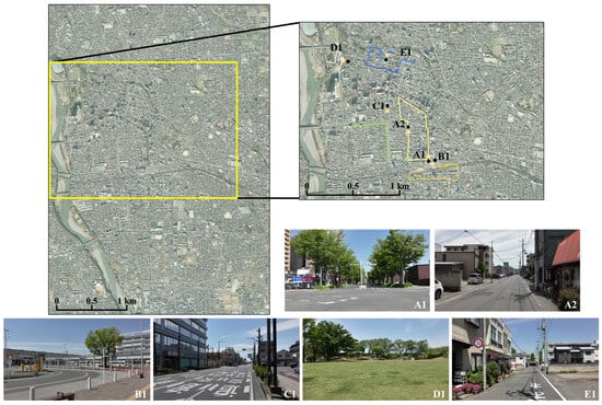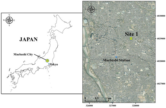 The study area, Maebashi City, Gunma Prefecture, is located in the northwestern area of the Tokyo metropolitan region in Japan and is centered on the island, with the greatest possible distance to the east and west coasts (Figure 5). The study area for the whole city scale is focused on the central area of the city, where the main Maebashi station is located in the scene center (densely urbanized area). To the south and north-east, there are sparser built-up areas, and patches of agricultural land start to appear. The western side features a river crossing from north to south through the city. The site length in the north-south direction is approximately 4.5 km, and that in the east-west direction is approximately 3.2 km. Site 1 in the figure indicates the area where the UAS survey was conducted. Site 1 is a closed junior high school with variations in land cover, including bare soil, grassy vegetation, trees, buildings, and asphalt, each exhibiting different thermal trends. Microscale sampling was conducted in this area. The climatic conditions of Maebashi city vary within a year. Our fieldwork was carried out on 25–26 August 2020. The daily average maximum temperature in August 2020 was 35.1 °C, and the peak maximum reached 39.8 °C. Maebashi City is always given attention to the nation’s temperature observations because this region is characterized by a hot summer climate. The total precipitation was 64.5 mm, and the average relative humidity was 68%, which indicates extremely hot and moist conditions, leading to much higher discomfort.