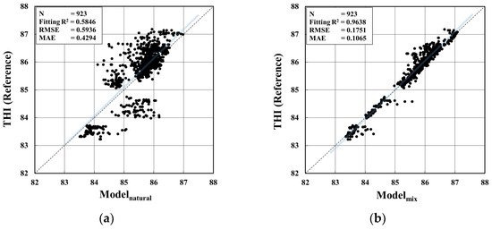 Figure 12 shows the validation results between the two developed models: Modelnatural and Modelmix. For the Modelnatural, the fitting R2 showed a moderate fit of 0.5846, the RMSE = 0.5936, and the MAE = 0.4294, slightly lower than the required R2. The larger residuals around THI < 84 are assumed to be associated with sensor lag (low response time) during ground surveying. The sensor is necessary to settle to the actual temperature and humidity; therefore, if sampling were conducted for a more limited time frame in shadow areas than entering exposed zones or vice versa, then the reference values would be slightly off from the actual values, and this was also presented by Iizuka and Akiyama [22]. The samples were collected along tree-lined streets and then in higher radiation-exposed areas. Thus, the reference would show a lower value than the modeled value. Two segments with large model errors are relevant to the following issues. First, the high residuals of THI > 85 explain why the reference set features higher THI values than the model. With natural factors only, the modeled values would be expressed as a lower THI area; however, this is not true. This is expected to be the limitation of using only natural factors that may not express the true thermal condition. It is understood that SUHIs are also affected by anthropogenic factors [23,24] along with both buildings and vehicles [10]. In fact, the works by Husni et al. [49] indicate the increase in SUHI effects with increasing traffic ques on urban streets, and Chen et al. [50] also find that vehicle heat affects significantly in areas mainly low urbanized regions with large traffic flows and highly urbanized regions with tall buildings. Therefore, the vehicles and buildings that emit heat in the city might be the remaining source for correctly modeling the THI. Second, the high residuals of the THI range of 84–85 could be from a similar issue, but in this case, the high THI model result may be suppressed by cooling effects in the city. This can be due to shadows from trees or buildings that may act as a cooling source [20]. The second model, which included anthropogenic factors, was also developed to better understand this hypothesis using vehicle density and building floor area (Modelmix). The result was remarkable, and the validation between the model and reference set showed that the residuals became much smaller. The fitting R2 = 0.9638, RMSE = 0.1751, and MAE = 0.1065. This implies that it was true that such anthropogenic factors can act as sources of both heating and cooling, depending on the area structure and the surrounding environment.