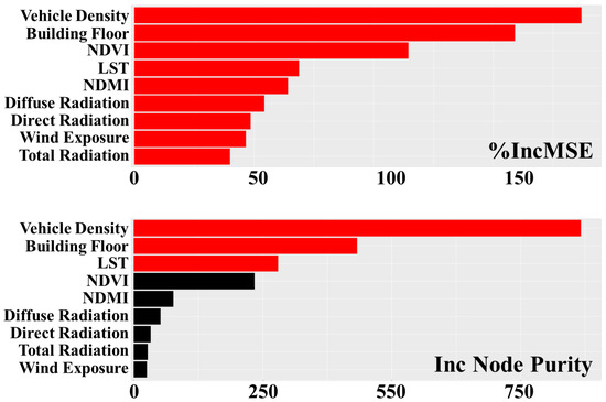 Figure 13 shows the contribution of the variables to the developed model. The two figures indicate the mean increase in node purity (Gini Index) and the percent increase in the mean squared error (%incMSE). The Gini index measures how well the variable can split a node, while the %incMSE provides an estimate of how much the accuracy will decrease when the variable is excluded. Regarding %incMSE, vehicle density has the greatest effect, followed by building floor, NDVI, LST, NDMI, diffuse radiation, direct radiation, wind exposure, and total radiation, which are all significant in terms of variable importance. For splitting the nodes, the Gini index shows higher importance for vehicle density, building floor, and LST, which are the significant variables, followed by the other variables, although these variables still provide some degree of contribution to the model. Note that the trend is checked for the SUHI and might differ for different boundary layers [20].