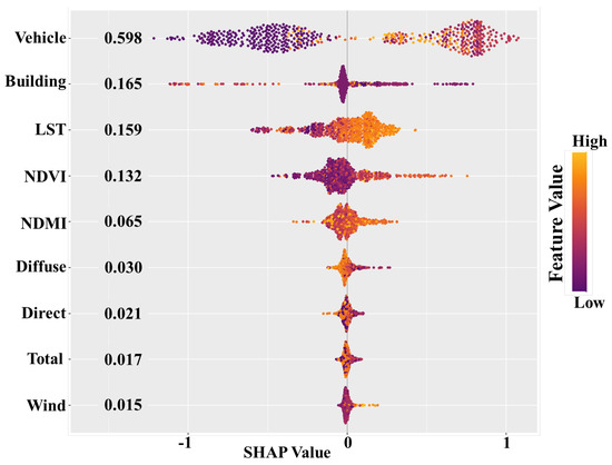 Building floor area also significantly influenced our model predictions, aligning with existing research on microscale variations of the SUHI effect. Such variations are increasingly recognized as crucial for understanding urban microclimates at the level of individual streets and buildings. For example, Hu et al. [51] found that building height is inversely related to LST, with taller buildings likely suppressing LST due to shading. Hwang et al. [32] observed greater discomfort in less shaded urban streets in central Taiwan, using the sky view factor (SVF) as a response variable. Sharmin et al. [31] showed that air temperature was positively correlated with the surface-to-volume ratio of surrounding buildings in residential areas but negatively correlated when commercial and educational areas were included. This suggests that residential areas might experience higher temperatures due to greater solar exposure, while commercial areas, with more heat retention and less ventilation, could also have higher temperatures, likely due to the urban canyon effect and increased anthropogenic heat. Mughal et al. [52], although not at the microscale level, conducted a Multilayer Urban Canopy Model to simulate Singapore’s urban climate, incorporating local climate zones (LCZs) for a detailed understanding of UHI effects. They found that compact high-rise buildings intensify UHI due to trapped heat and reduced ventilation. Their study emphasized the role of anthropogenic heat, particularly from air conditioning systems, in contributing to UHI. However, their work did not incorporate vehicle data, limiting their ability to distinguish the specific impacts of different sources of anthropogenic heat.