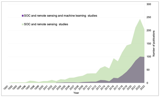 Temporal trend in SOC research using RS and ML techniques (data collection for the analysis was completed on 23 October 2023).