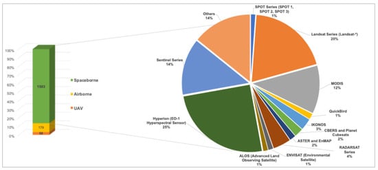 In SOC estimation, RS platforms demonstrate wide applications for extraction-related data, leveraging technologies such as drones and other unmanned vehicles, aircraft, and satellite-based systems. Airborne RS methods were applied in 179 studies, whereas drone RS was referenced in 56 studies, indicating its relatively limited usage in SOC studies (Figure 2). The statistical results on the usage of satellite RS platforms indicate that the Hyperion (EO-1 Hyperspectral Sensor) is the most widely used platform, appearing in 377 studies, which accounts for 25.08% of the total. This is followed by the Landsat Series (Landsat-*), used in 294 studies (19.56%), and the Sentinel Series, referenced in 204 studies (13.57%). MODIS was utilized in 174 studies (11.58%). Among other platforms, the RADARSAT Series appeared in 65 studies (4.32%), IKONOS in 43 studies (2.86%), and CBERS and Planet Cubesats in 33 studies (2.20%). ASTER and EnMAP were cited in 23 studies (1.53%), QuickBird in 22 studies (1.46%), ENVISAT in 19 studies (1.26%), ALOS in 18 studies (1.20%), and the SPOT Series (SPOT 1, SPOT 2, SPOT 3) in 17 studies (1.13%). Notably, there were 214 studies that remained uncategorized, representing 14.24% of the total (Figure 2).