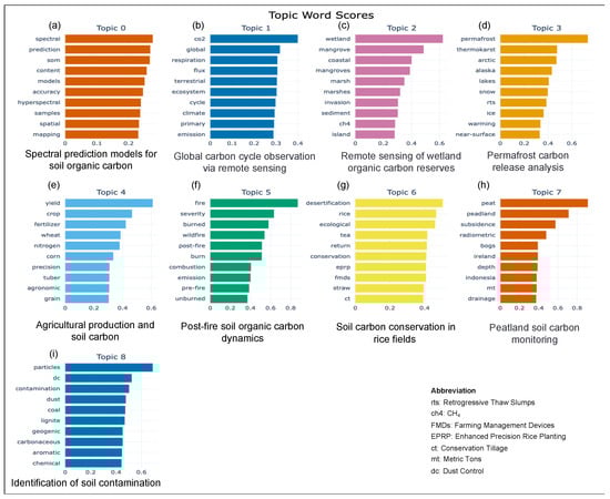 Through BERTopic analysis, the SOC and RS research corpus revealed nine thematic clusters. Topic 0 encapsulates study leverage spectral models and hyperspectral imagery for SOC estimation, reflecting advancements in spatial mapping technologies. In Topic 1, there is a concentration of research on the carbon cycle within terrestrial ecosystems, specifically focusing on carbon dioxide fluxes and respiration processes. Topic 2 highlights wetland SOC dynamics, including methane emissions and the impact of invasive species on sediment, emphasizing the ecological significance of wetlands in the carbon cycle. In Topic 3, the focus is on the impact of climate change on permafrost and thermokarst lakes, with a particular emphasis on SOC stability and climate feedback loops. Topic 4 investigates the influence of agricultural practices on SOC sequestration, investigating the roles of crop management, fertilizer application, and precision farming techniques. Research on the impact of wildfire severity on SOC content is covered in Topic 5, signifying a specialized interest in the interplay between fire events and SOC dynamics. Topic 6 centers on soil conservation within rice cultivation systems, encompassing straw management and conservation tillage techniques. In Topic 7, studies elaborate on peatland SOC, employing radiometric dating to understand SOC accumulation patterns. Lastly, Topic 8 identifies research on the contamination of SOC by particulate matter from both natural and human-induced sources. Each identified topic represents a distinct focus within the SOC and RS domain, highlighting the variety of research interests and methodologies utilized in this scientific field (Figure 3).